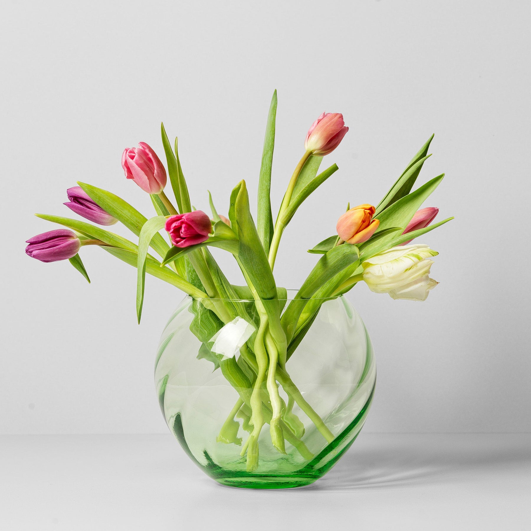 Beautiful In Flore Eva Vase in a clear green color. Our Eva vase is handmade in crystal glass with characteristics of sparkling clarity and brilliance.