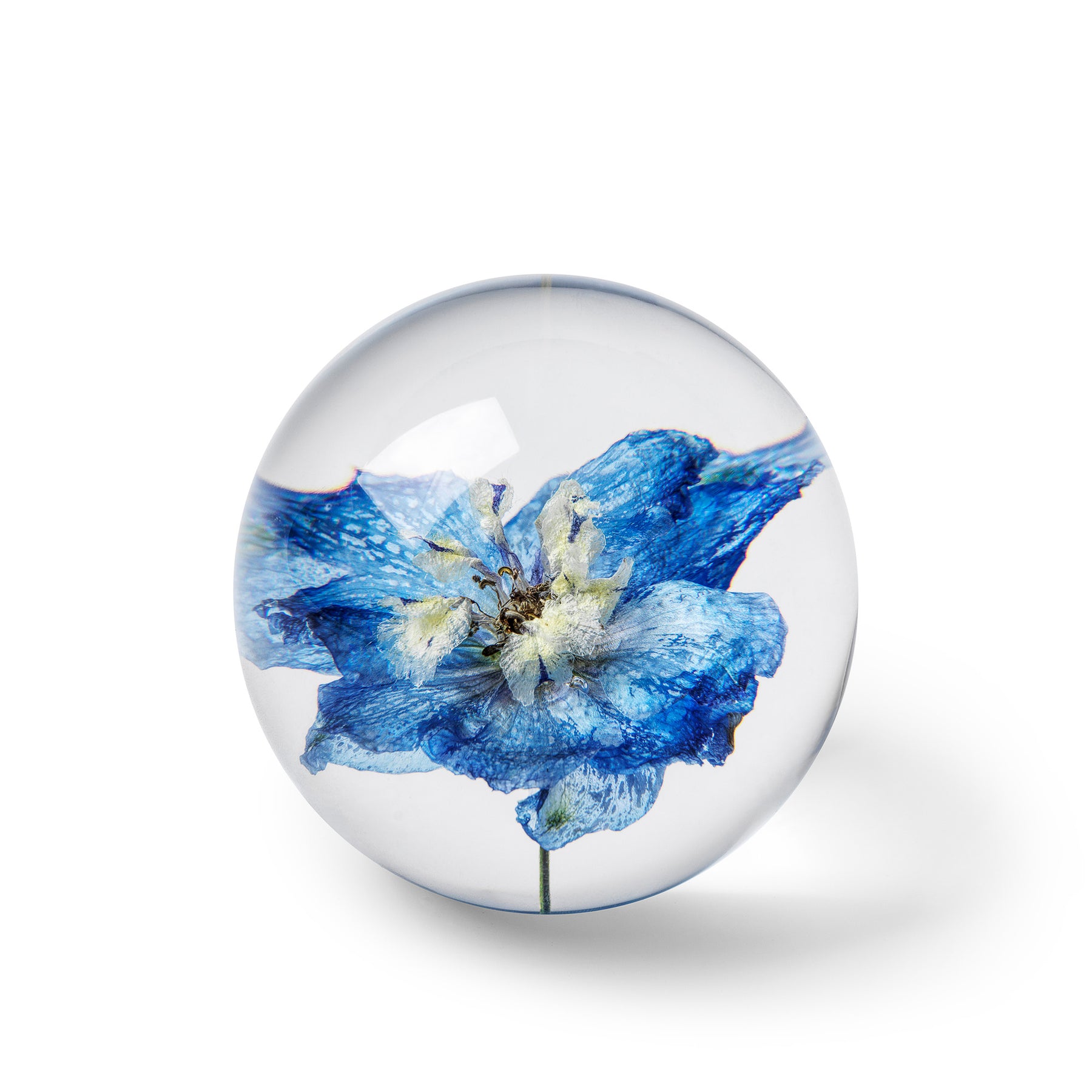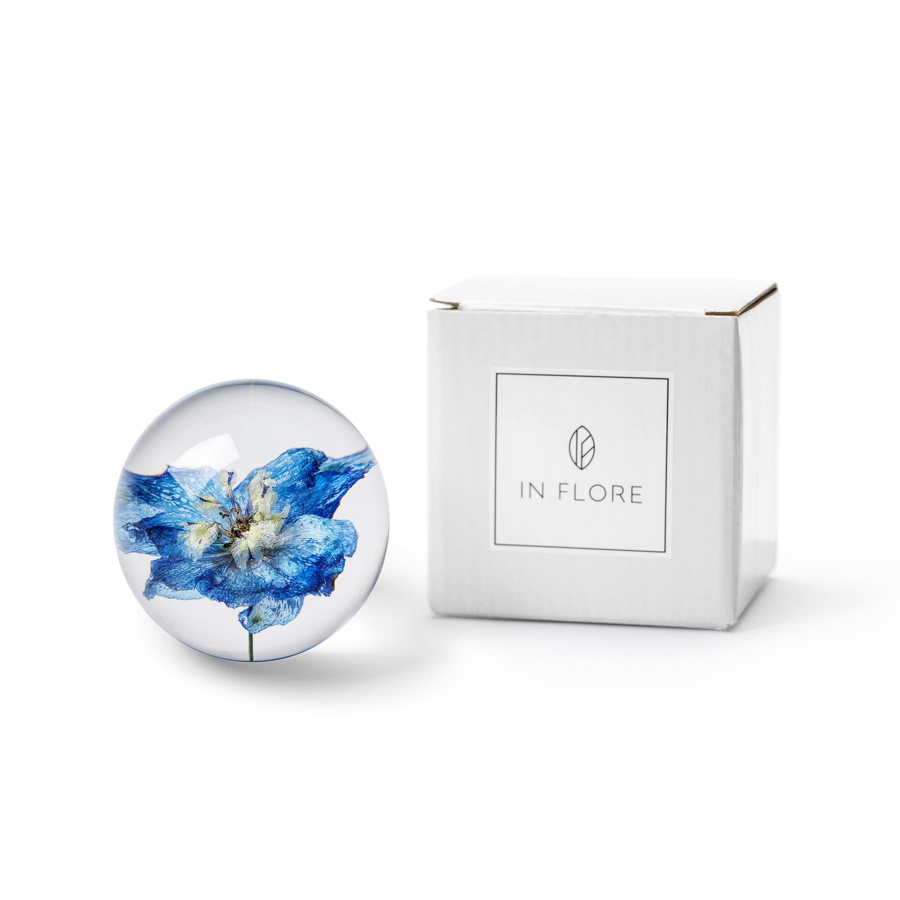 Beautiful In Flore Bleu paperweight featuring a dark blue larkspur flower. The paperweight is made from crystal resin with a real light blue flower moulded inside.
